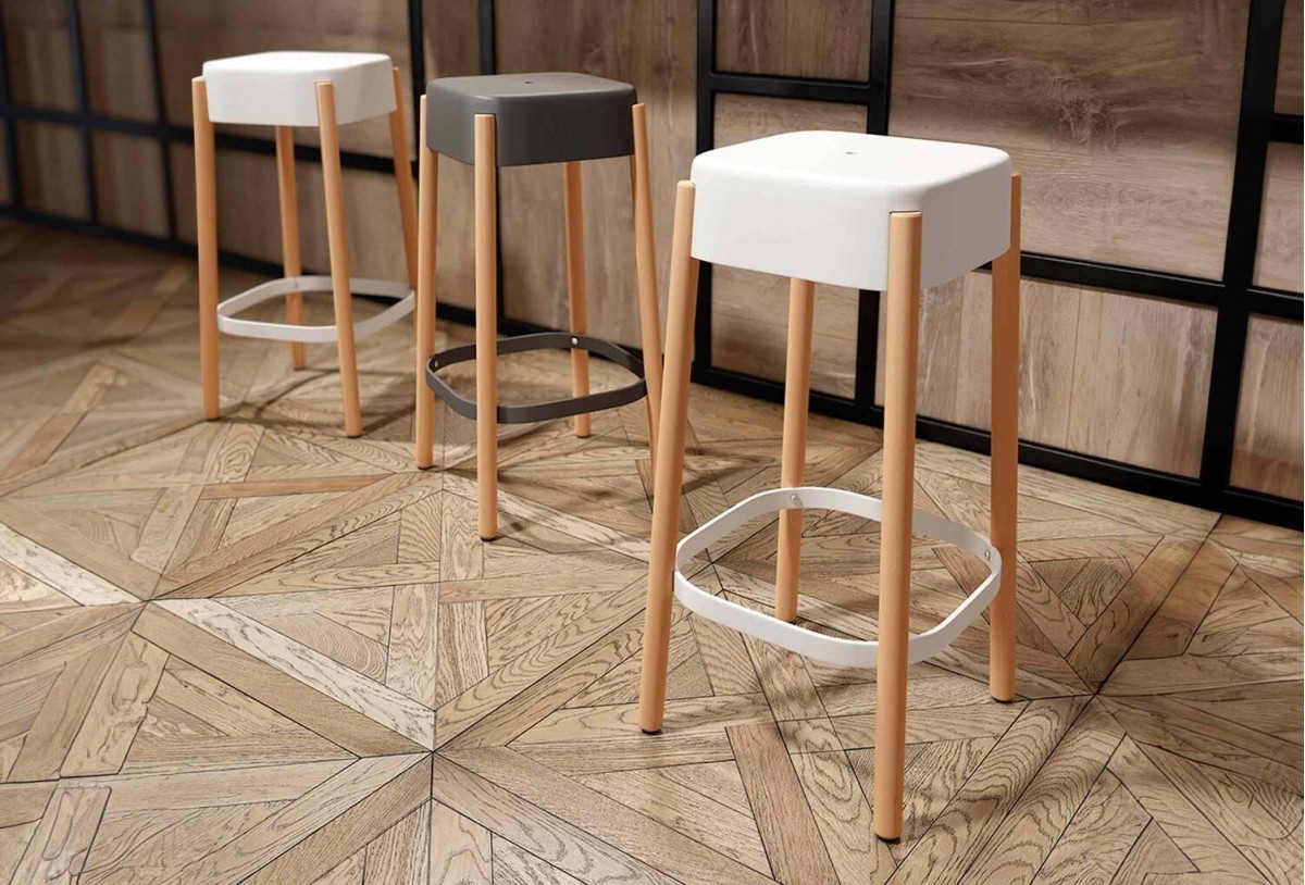 Taburete con patas de madera maciza y aisento de polipropileno en dos acabados distintos. Color grafito y blanco con las patas en haya.