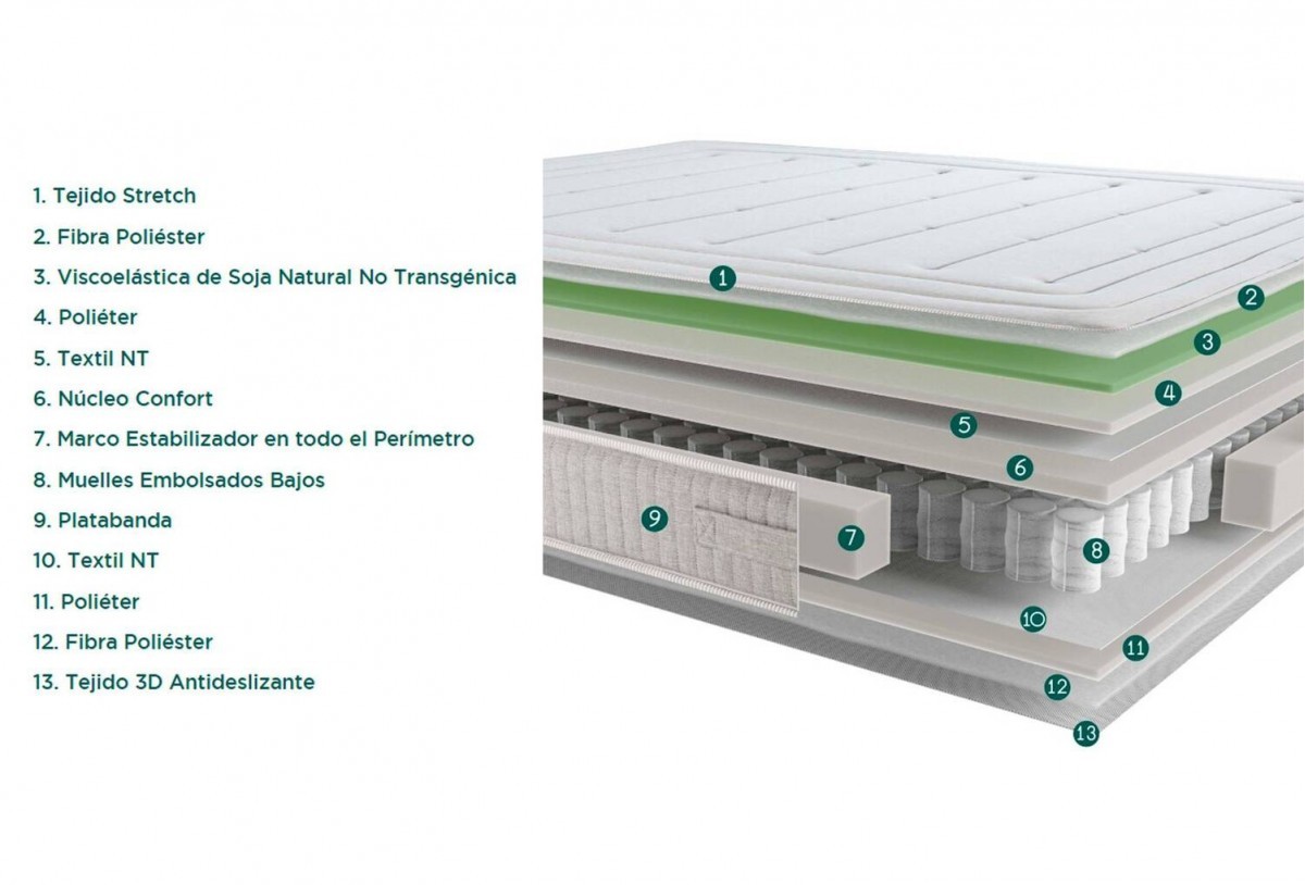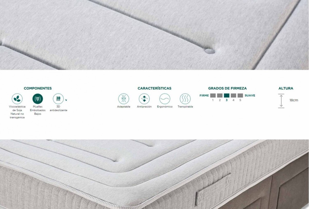 - Colchón de muelles embolsados bajos de 9 cm. y Viscoelástica de Soja Natural No Transgénica.