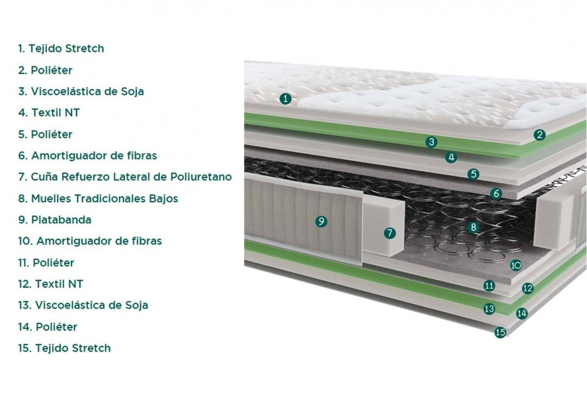 - Colchón de muelles tradicionales bajos y Viscoelástica de Soja.