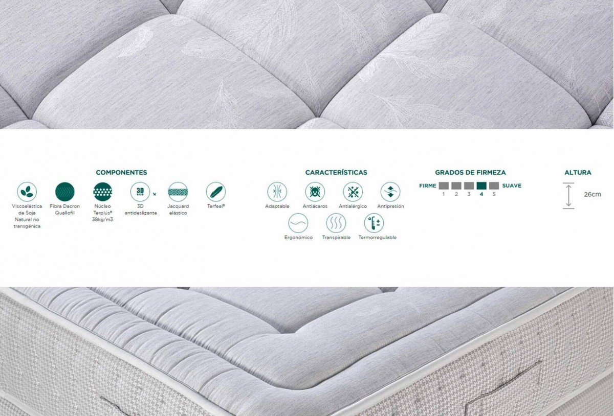 - Colchón con Terfeel® y Viscoelástica de Soja natural no transgénica con núcleo Terplús® 38kg/m3.