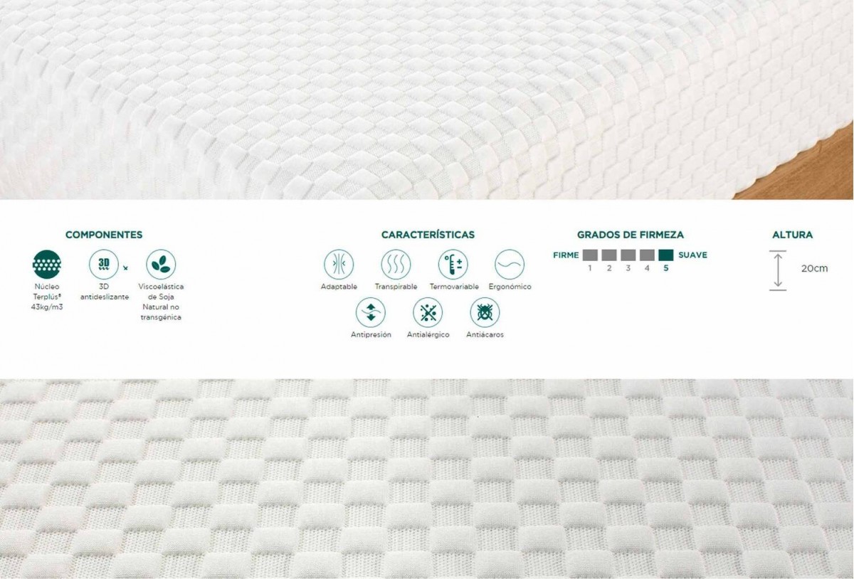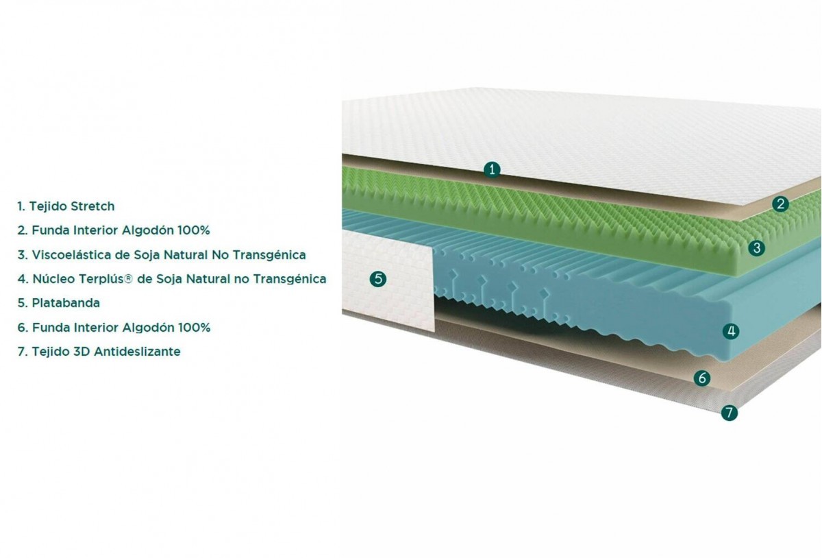 - Colchón de Viscoelástica perfilada de Soja Natural no transgénica (70mm) y Núcleo Terplús® (43kg/m3) con 5 zonas de confort de Soja Natural no transgénica perfilado y vaciado.