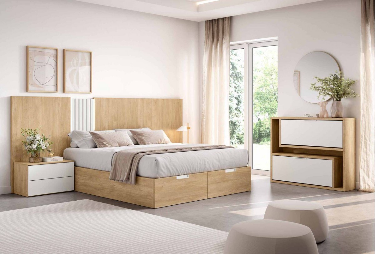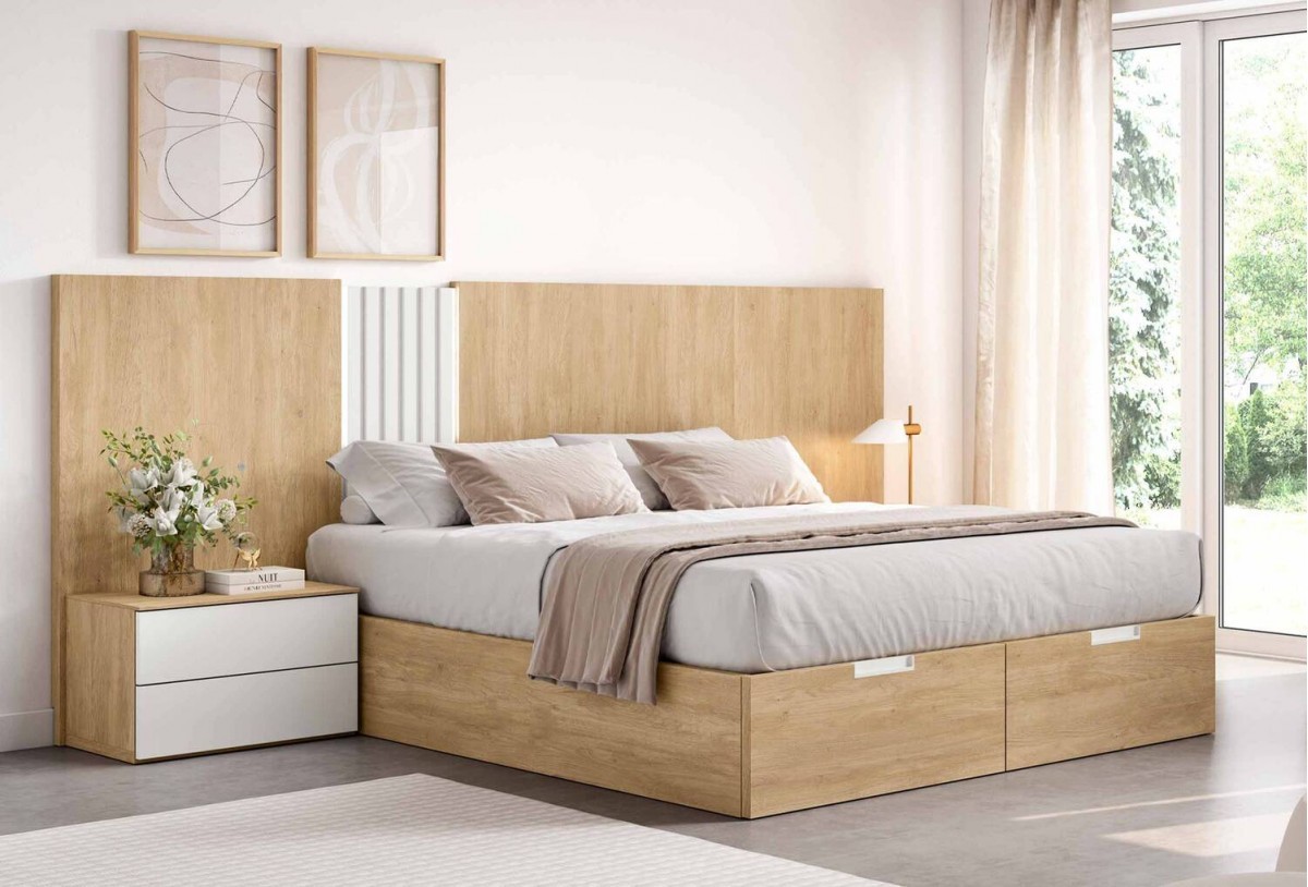 - Bancada de 158 x 198 x 32 cm (para somier de 150 x 190 cm) con arcón batiente, base tapizada y 2 cajones en piecero (no incluido en el precio)