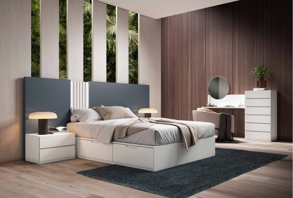 - Bancada de 154 x 194 x 32 cm (para somier de 150 x 190 cm) con 4 cajones laterales y arcón abatible (no incluido en el precio)