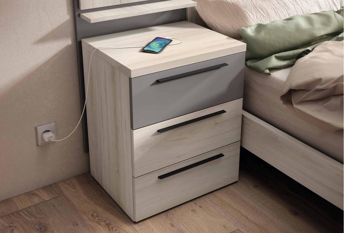 - Mesita de noche de 50 x 39,7 x 62 cm con 3 cajones y tirador color grafito