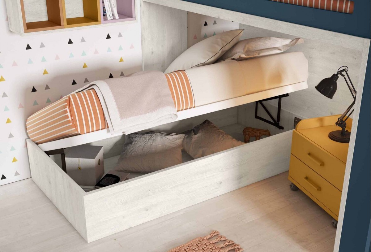 - Cama nido de 98 x 198 x 32 cm (para colchón de 90 x 190 cm) con arcón batiente tapizado