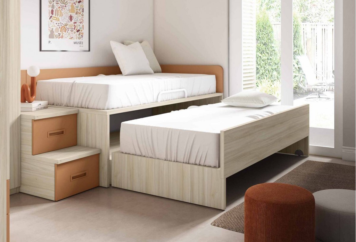 El dormitorio juvenil Mod. CLARENCE es ideal para maximizar el espacio en cualquier habitación juvenil. Este conjunto incluye un compacto con cama desplazable y una elegante escalera, proporcionando un entorno práctico y moderno.