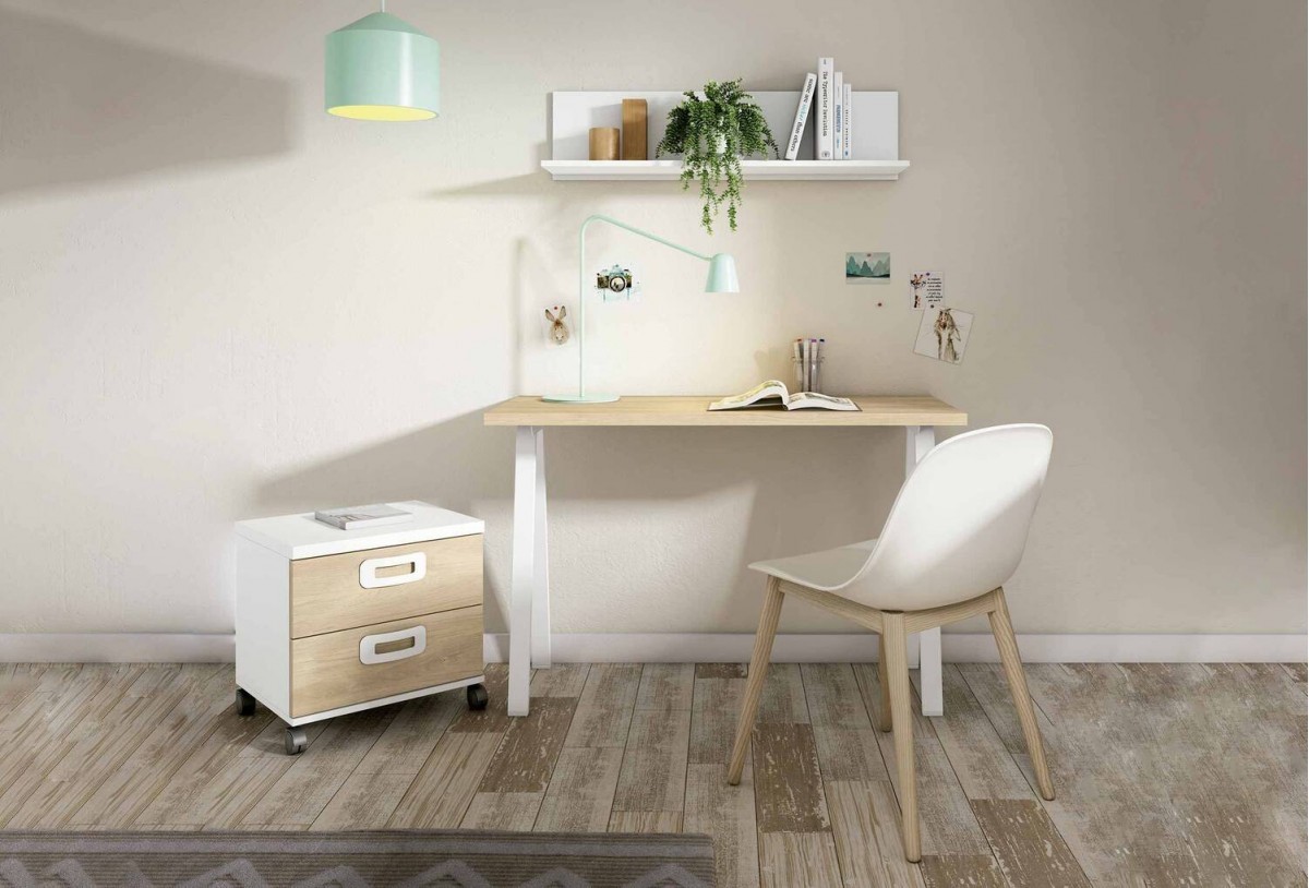 9x44.5x74.8 cm cada uno. Estructura vista, estética ligera y estabilidad asegurada. Permiten limpiar por debajo con facilidad y dejan libre el área para la silla de estudio sin chocar con zócalos.