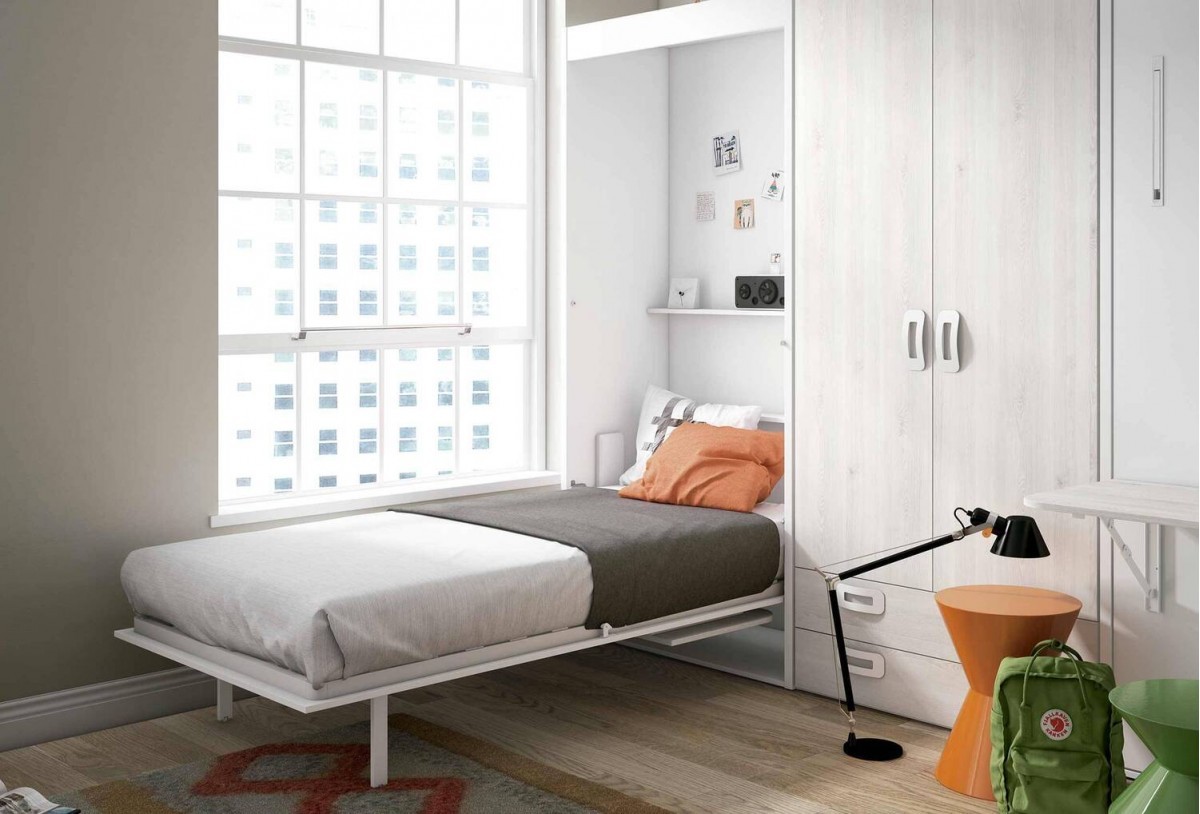 Dos camas abatibles verticales con mesas plegables y armario con cajones: máximo rendimiento en una habitación juvenil compacta