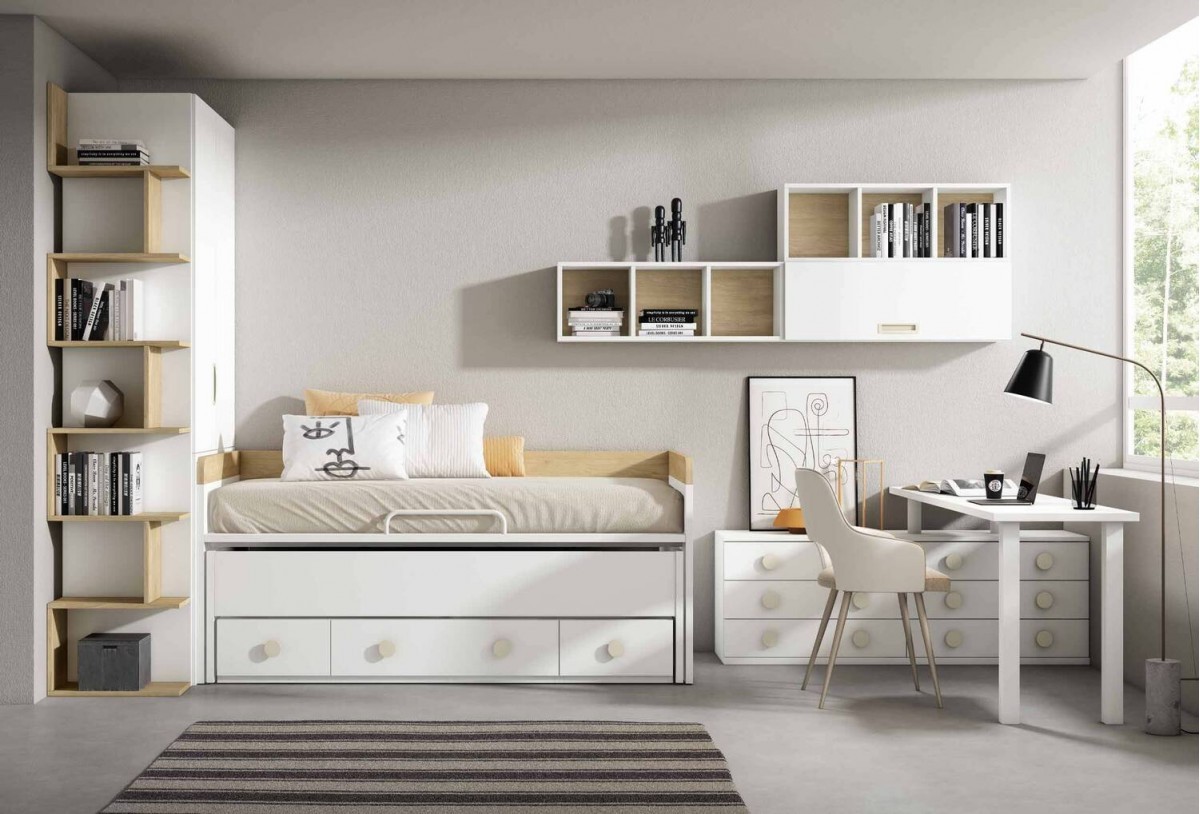 El dormitorio juvenil Mod. CLOAK maximiza el espacio en la habitación juvenil. Su diseño moderno incluye un compacto con cama desplazable, armario con arcón y estantería amplia, ideal para jóvenes organizados.
