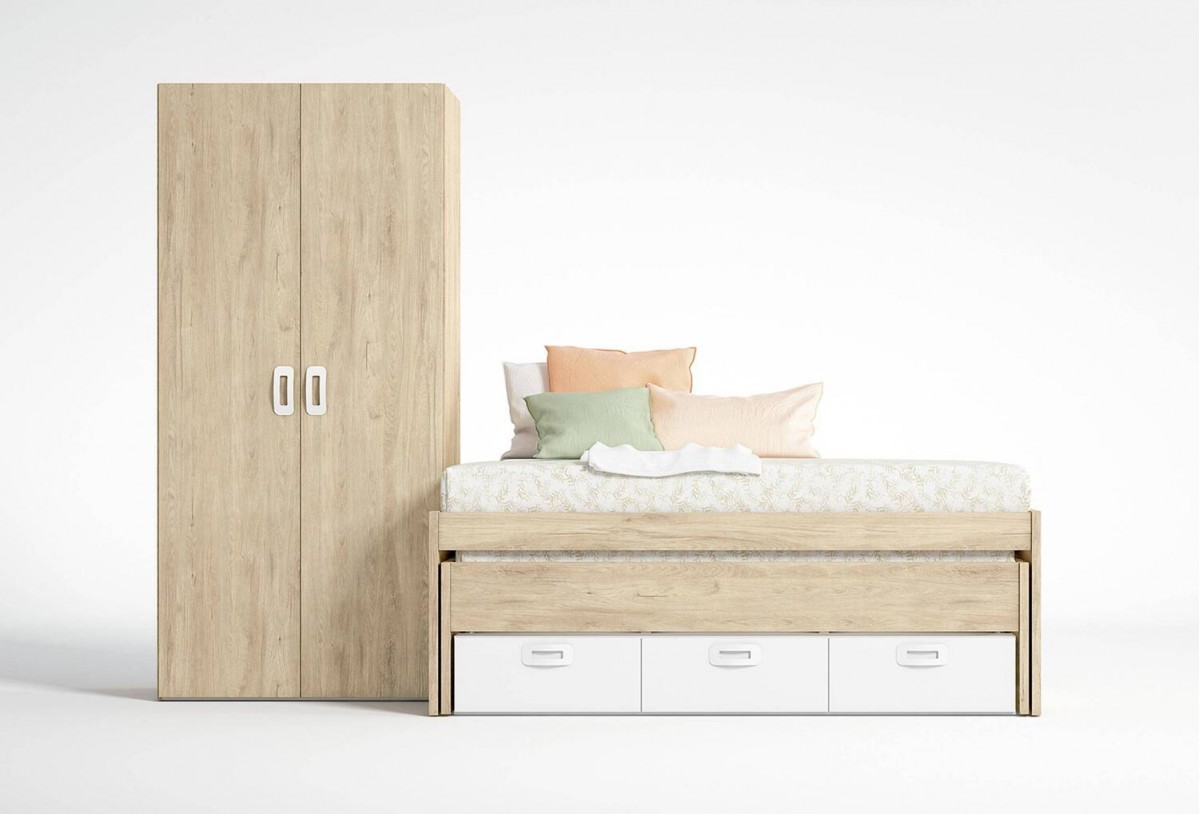El conjunto MATE está concebido para rendir de lunes a domingo sin volverse exigente. El armario de 100.5 cm de ancho aporta una organización clara: colgado principal a altura cómoda y espacio superior para cajas o temporada. Su fondo funcional admite percha estándar con holgura justa para que las puertas cierren con suavidad, y la altura completa ayuda a mantener fuera de la vista lo que no hace falta a diario. A su lado, el compacto recto de 202 cm integra la cama principal (para colchón 190x90 cm), una cama desplazable oculta del mismo formato y tres cajones contenedores profundos. Así evitamos módulos auxiliares dispersos y concentramos el almacenaje donde realmente se usa: cerca de la cama.