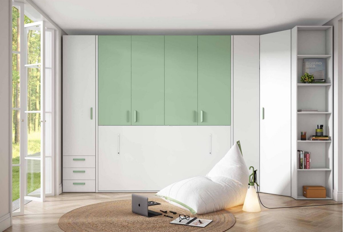 Los colores de las imágenes son orientativos y pueden variar sutilmente respecto al acabado real debido a la iluminación y la calibración de pantalla. En tienda revisamos contigo muestras físicas para prevenir sorpresas. Nuestra recomendación habitual en habitación juvenil con cama abatible es mantener base neutra (blancos rotos, arenas, roble claro) en el bloque de armarios y reservar los acentos (azules medios, verdes suaves o arcillas) para frentes de cajón, estantes terminales o tiradores. Así reforzamos la sensación de amplitud y reducimos el “peso” visual del frente a toda altura.