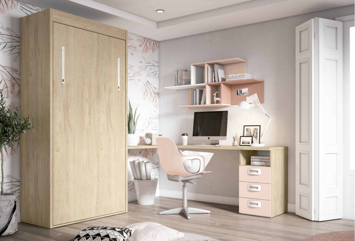 En Muebles El Paraíso hemos diseñado esta composición pensando en habitaciones que necesitan rendir el doble sin renunciar a la estética. El dormitorio juvenil ALEGRÍA combina una cama abatible vertical para colchón 90x190 con una mesa de estudio en rincón a medida y almacenaje ligero en pared. De día, la zona queda despejada para estudiar y moverse con libertad; de noche, la cama baja en el mismo frente, dejando todo ordenado y a mano. Es una solución versátil para habitación juvenil donde el metro cuadrado importa.