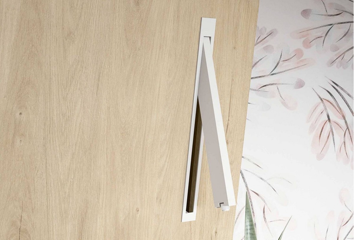 La cama es abatible en vertical, diseñada para un uso cotidiano seguro y cómodo. El frente queda enrasado cuando está cerrada, liberando el paso. Recomendamos mantener un área despejada frente al módulo para accionar la apertura y el cierre sin interferencias, así como fijar la instalación a pared conforme a las instrucciones del fabricante para garantizar estabilidad en todo momento.