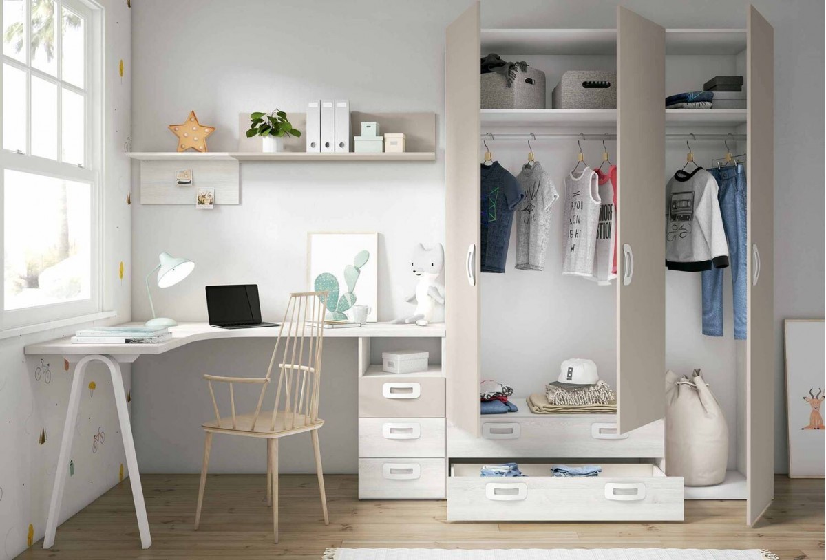 Todo encaja y nada sobra: cama 90x190 con cabezal, armario 3 puertas y escritorio de rincón a medida para que cada metro trabaje a tu favor.