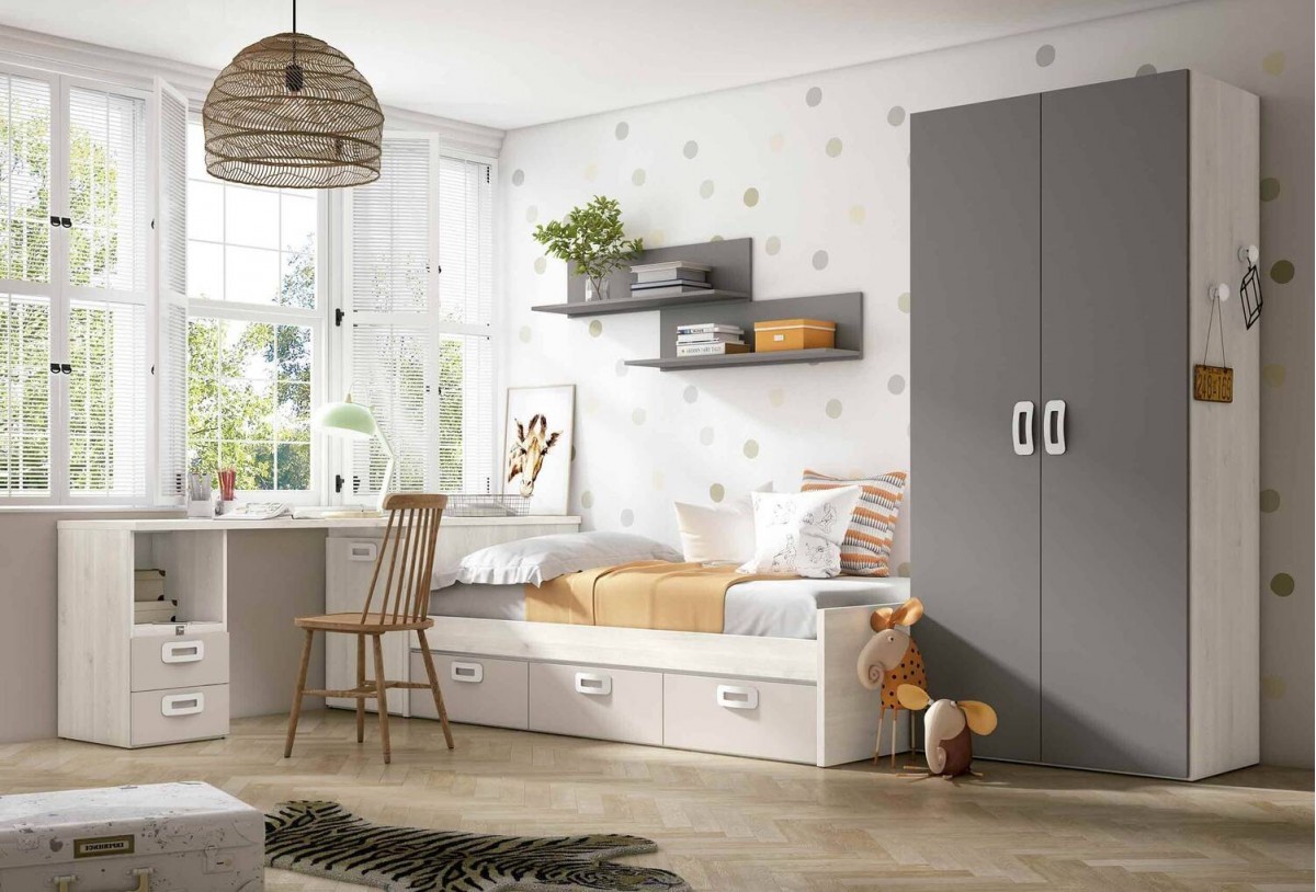 El dormitorio juvenil SULLEY combina una cama nido con cajones, un frente de armario de 2 puertas y una zona de estudio lineal para crear una habitación juvenil funcional, compacta y ágil. Hemos seleccionado piezas que conviven sin estorbar: almacenaje donde hace falta, superficie de trabajo continua y módulos auxiliares que suman utilidad sin sobrecargar. Es una composición que encaja muy bien en cuartos rectangulares y aprovecha el largo de pared para dar respuesta a descanso, estudio y orden en un solo gesto.
