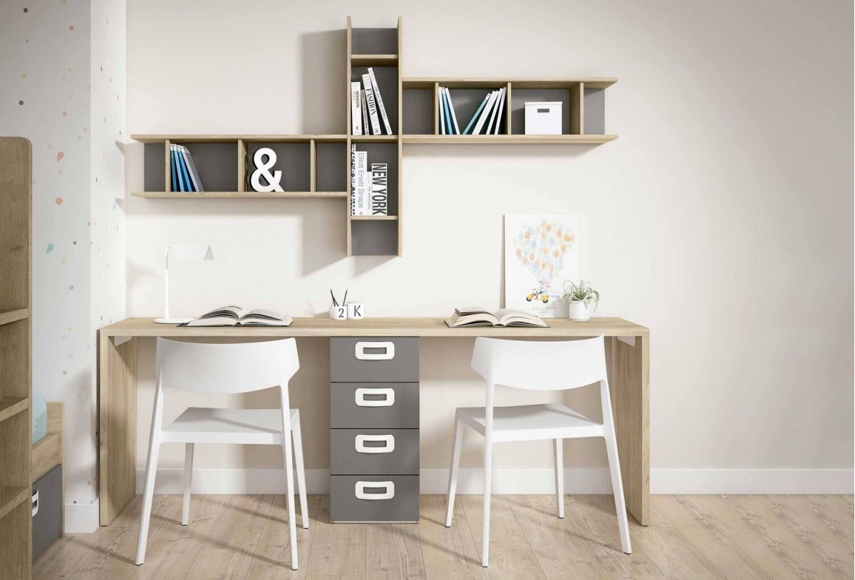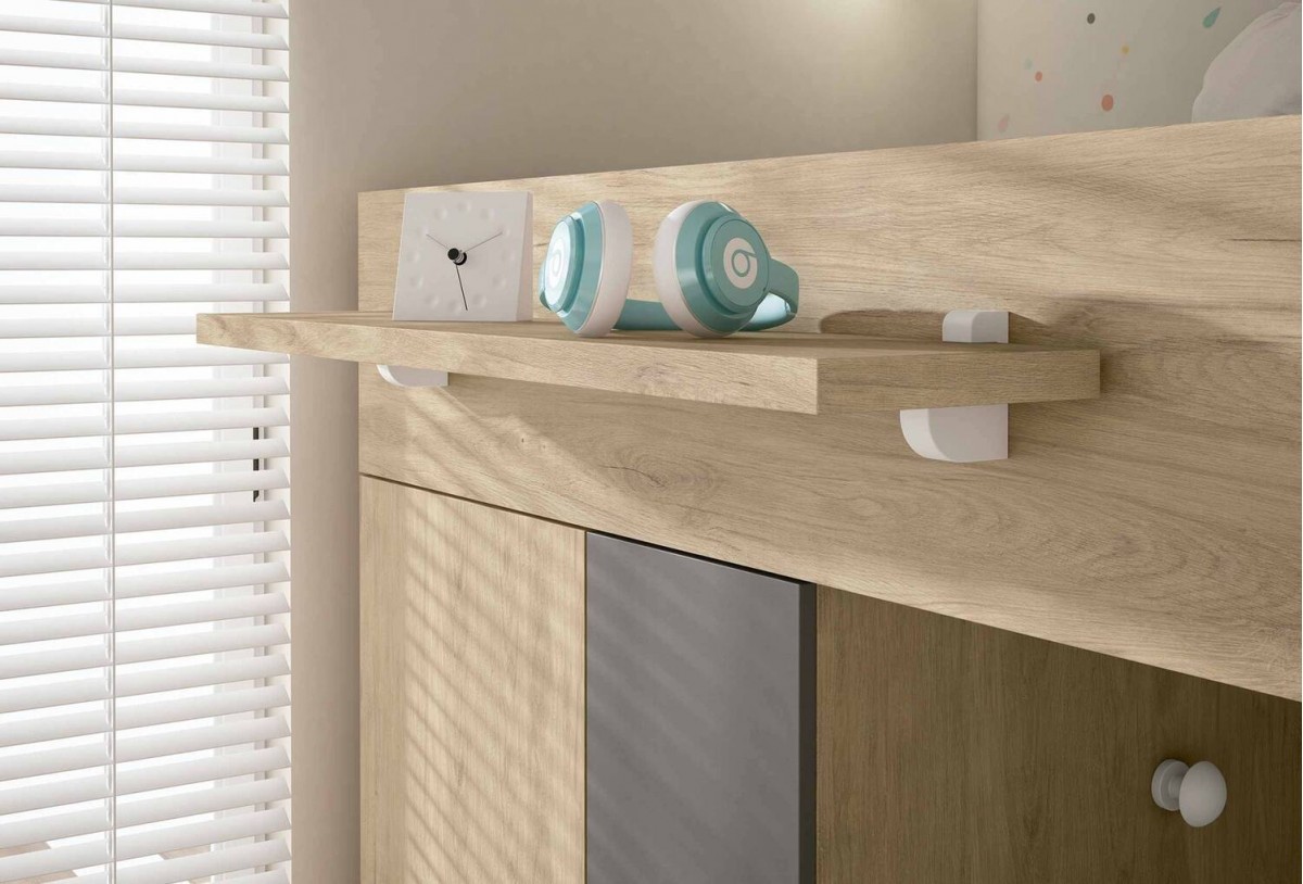 El conjunto, al concentrar descanso, estudio y almacenaje en una misma línea, libera el resto de la habitación juvenil para circulación, juego o una alfombra de lectura. Visualmente, el tren compacto crea un zócalo firme sobre el que flotan estantes y mesa: la pared “respira” y la estancia parece más amplia.
