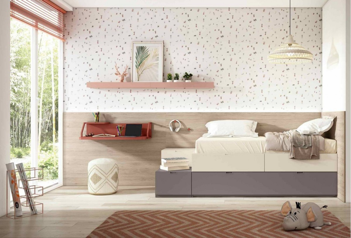 Cama con arrastre, respaldo protector y escritorio mural para estudio diario