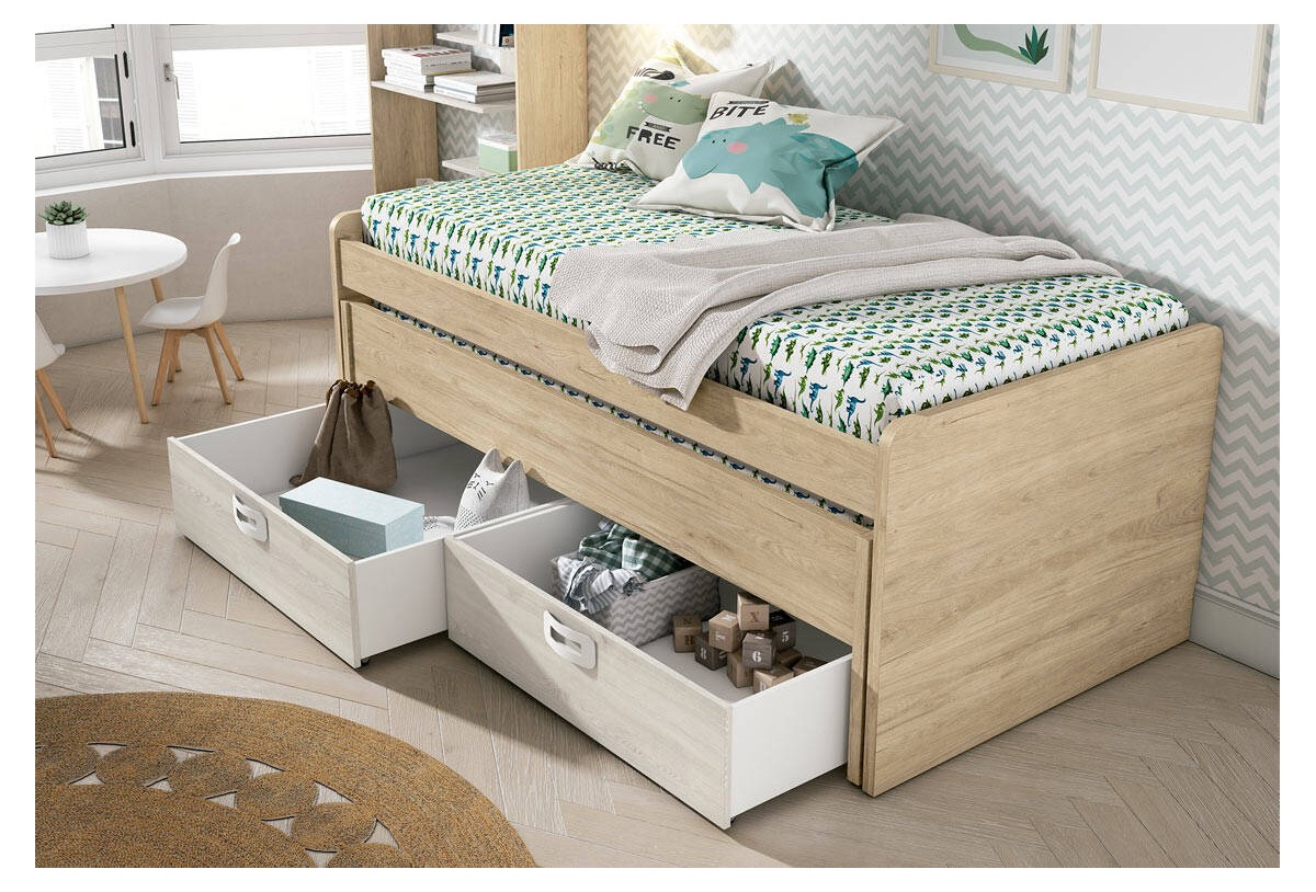 - Compacto curvo de 202 x 99,5 x 73,5 cm (para colchón de 190 x 90 cm) con cama desplazable oculta y 2 cajones con ruedas