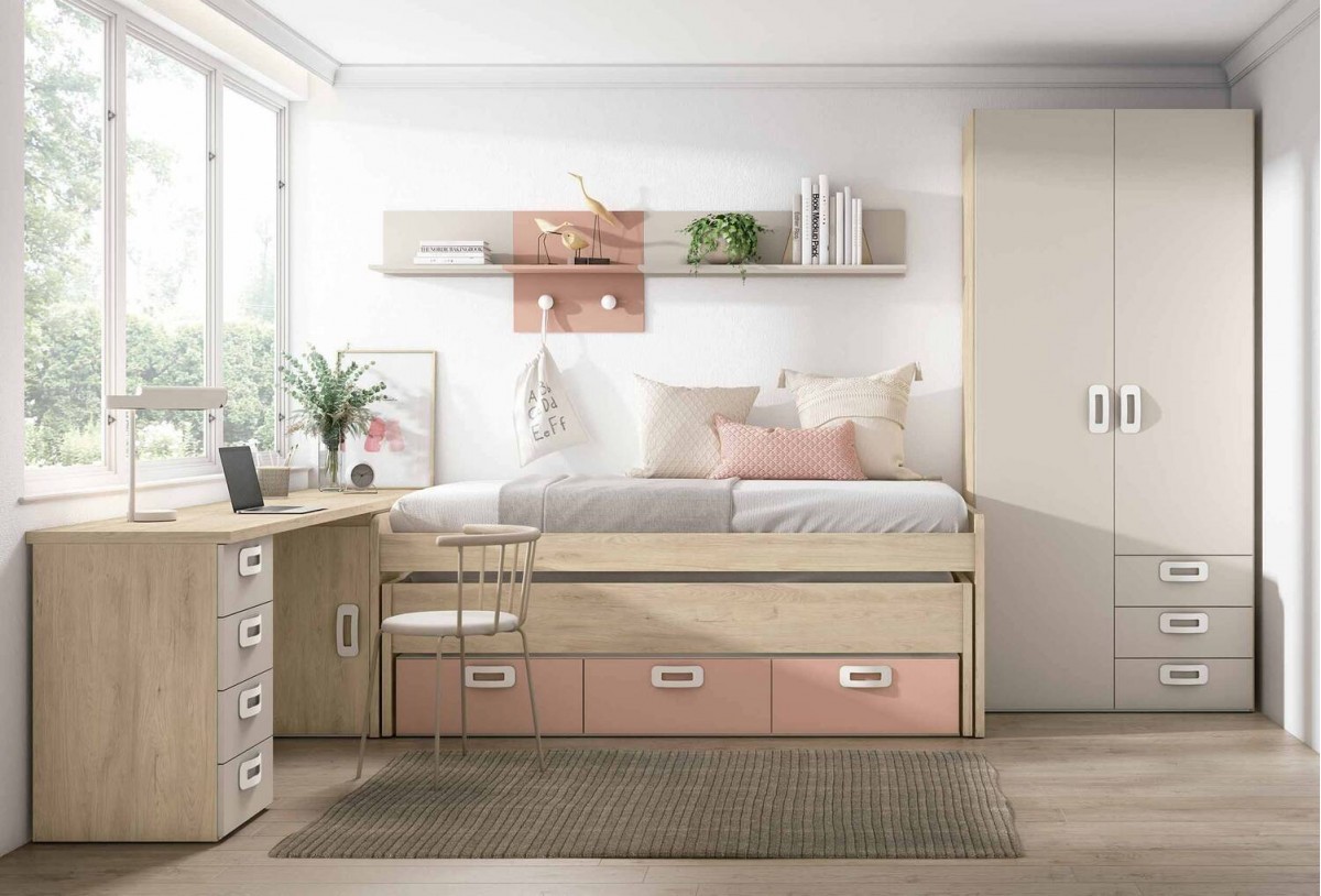 Compacto curvo con cama desplazable oculta: la cama principal queda integrada y la segunda cama aparece solo cuando hace falta. Además, los 3 cajones contenedores del compacto son un punto fuerte: en un dormitorio juvenil, esos cajones suelen ser los que “salvan” el orden.
