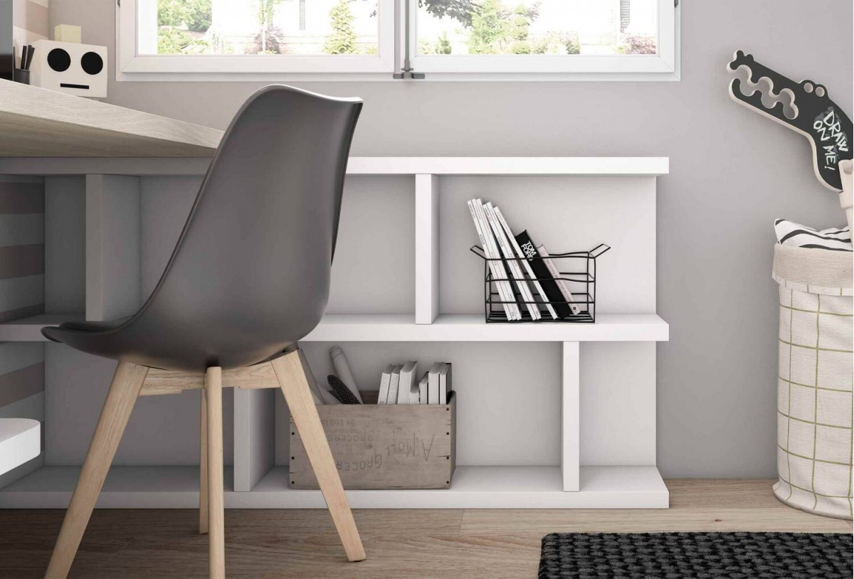 Base en maderas claras/blanco con acentos suaves en terminal/estante para mantener amplitud. Inspírate con más ideas de dormitorios juveniles.