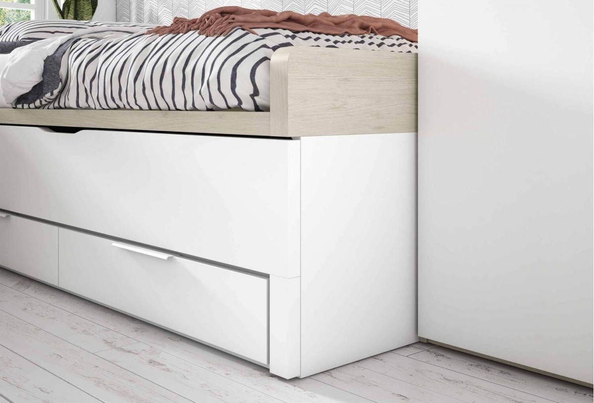 La bicama serie 3 207,5×101×74 cm (diseño atamborado) aloja dos camas de 190×90. La inferior lleva frenos y ruedas ocultas para un uso suave y seguro (requiere somier o tabla). El diseño atamborado aporta espesor visual y estabilidad.