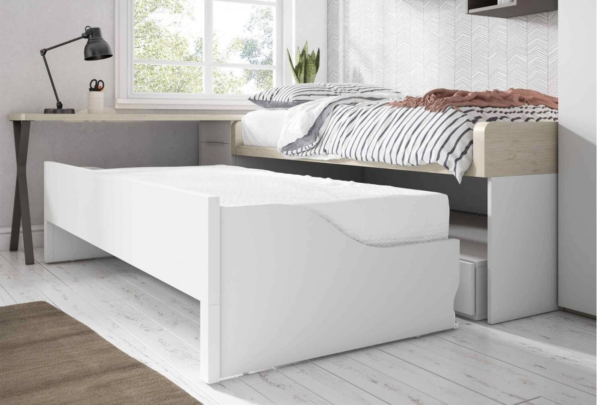 207,5×101×74 cm · Para 2 camas 190×90 cm · Cama inferior con frenos y ruedas ocultas · Requiere somier/tabla.