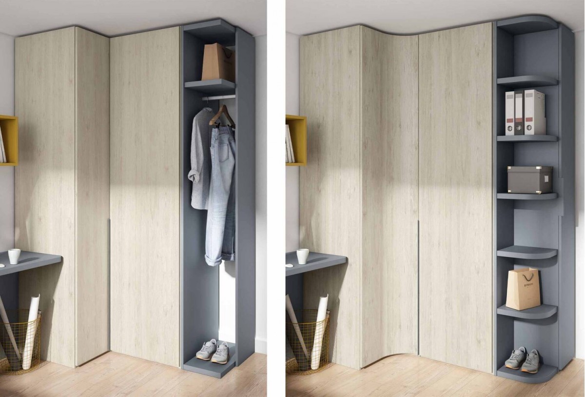 Armario rincón recto izquierdo 101x123x220 cm (interior estándar; puerta derecha 60 cm, izquierda 40 cm) y terminal con barra 59.5x32x220 cm. Si buscas un conjunto cerrado con armario, visita nuestras series completas.