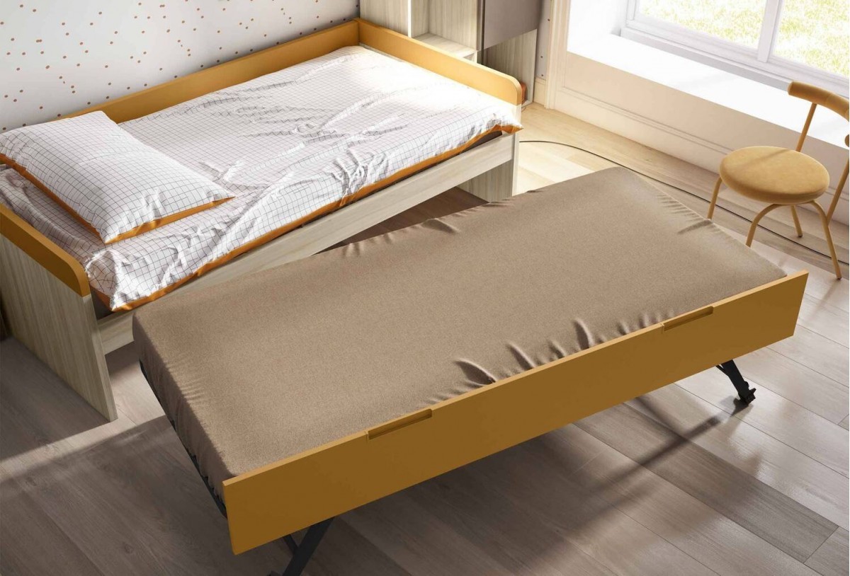 Esta cama de 202 x 102 x 66 cm está diseñada para un colchón de 190 x 90 cm y cuenta con un somier de arrastre para acomodar a un huésped adicional.
