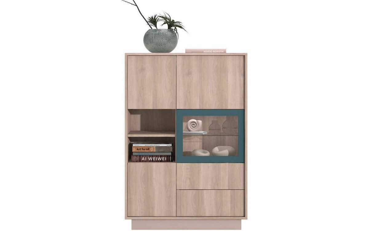 - Bajo de 100 x 42 x 136 cm con 2 cajones derecho, 1 puerta cristal, 3 puertas y hueco, con zócalo de 9 cm de alto