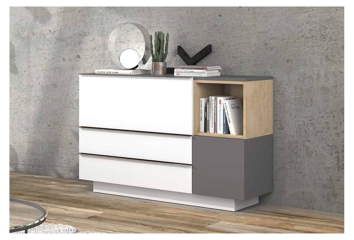 El aparador de 140 cm Park, 140 cm que complementara tu decoración a la perfección. Su diseño sencillo con toques modernos, encantara a grandes y pequeños. Combínalo a la perfección con tu hogar con la amplia combinación de colores a disposición. Además de ser una pieza estética, también aporta funcionalidad a tu día a día. Su parte superior nos permitirá usarla como encimera, podremos complementar la superficie con alguna lámpara o elemento decorativo. Un amplio espacio de almacenamiento está dividido tras una puerta abatible y 2 amplios cajones, podrás tener al alcance de la mano tanto menaje extra para los días especiales como mantelería o cualquier útil que necesitemos. Por otro lado de forma contigua un espacio diáfano, podrás tener libros de consulta o revistas de actualidad y además bajo otro modulo bajo con puerta batiente, tendrás las películas favoritas de los pequeños de la casa siempre a mano.
