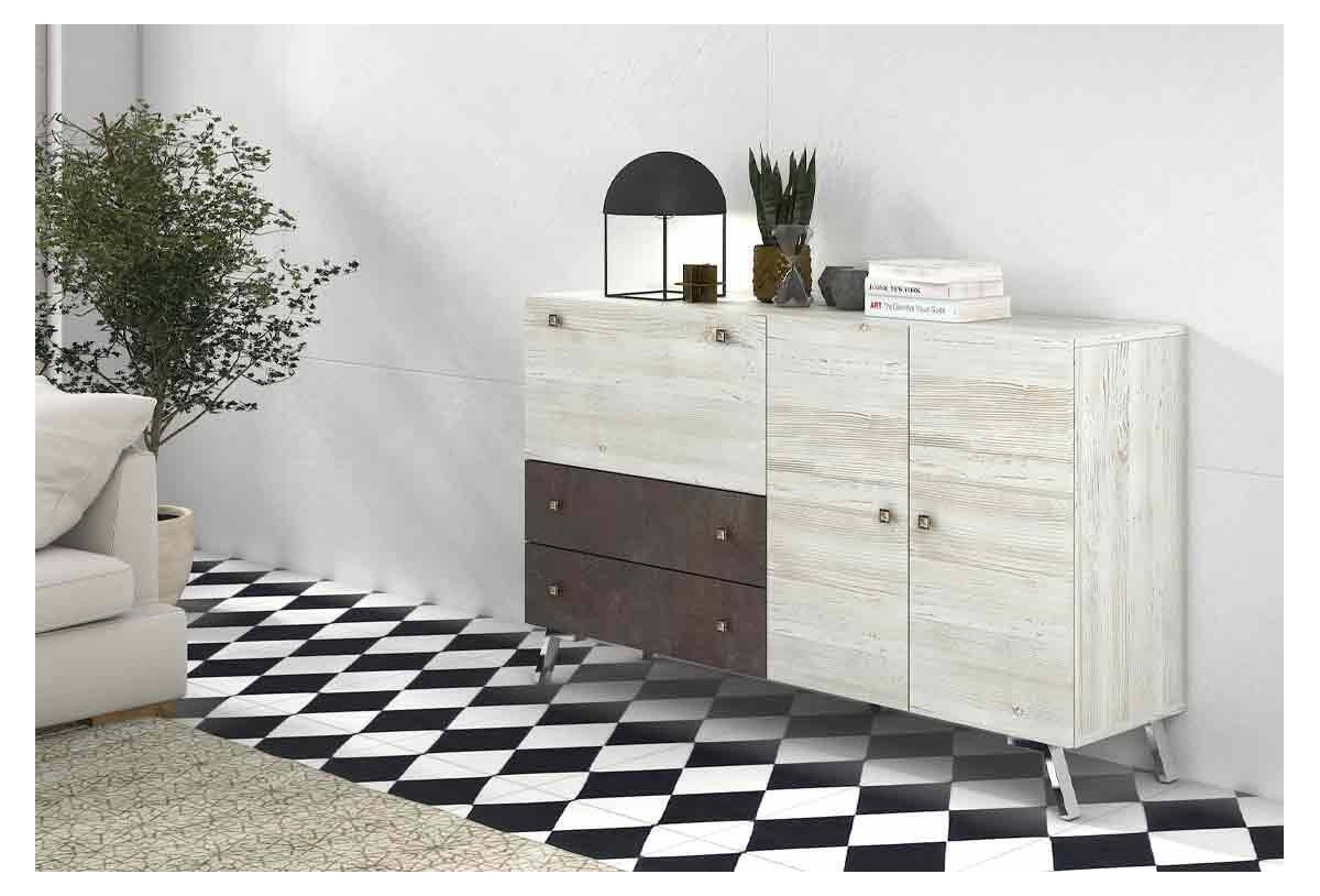 El aparador de 160 cm Browrad es el complemento ideal para el salón, una pieza que aportara a nuestra composición un estilo moderno y limpio. Se trata de un diseño sencillo y claro que combinado con la variedad de colores a disposición sera ideal para nuestro hogar. La superficie permite jugar la decoración para colocar algunos libros u ojeos de decoración. El espacio de almacenamiento se divide en diferentes zonas. Tras las puertas podremos organizar nuestro menaje extra como platos o fuentes para las visitas inesperadas, mientas que en la puerta abatible podremos tener organizada documentación en pequeñas carpetas o guardar juegos de copas. Ademas contaremos con varios cajones, donde podremos tener siempre a mano desde la cubertería, como la manteleria o cualquier objeto pequeño que necesitemos para el día a día. Un juego de 4 patas vintage dan un toque extra de elegancia a nuestra decoración.