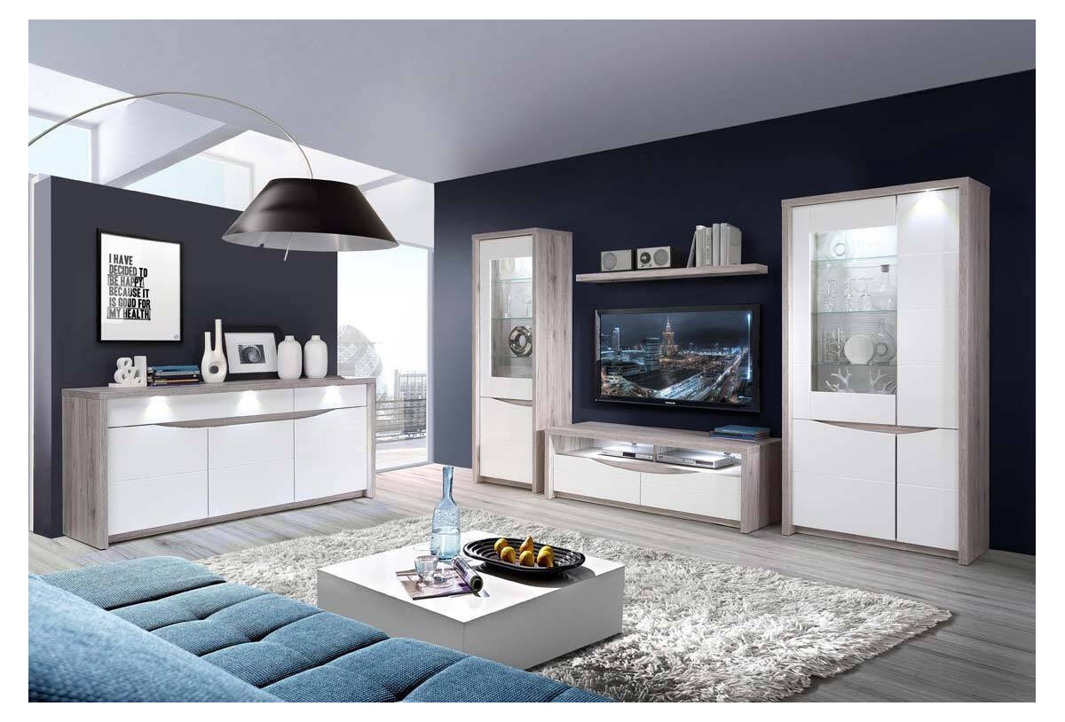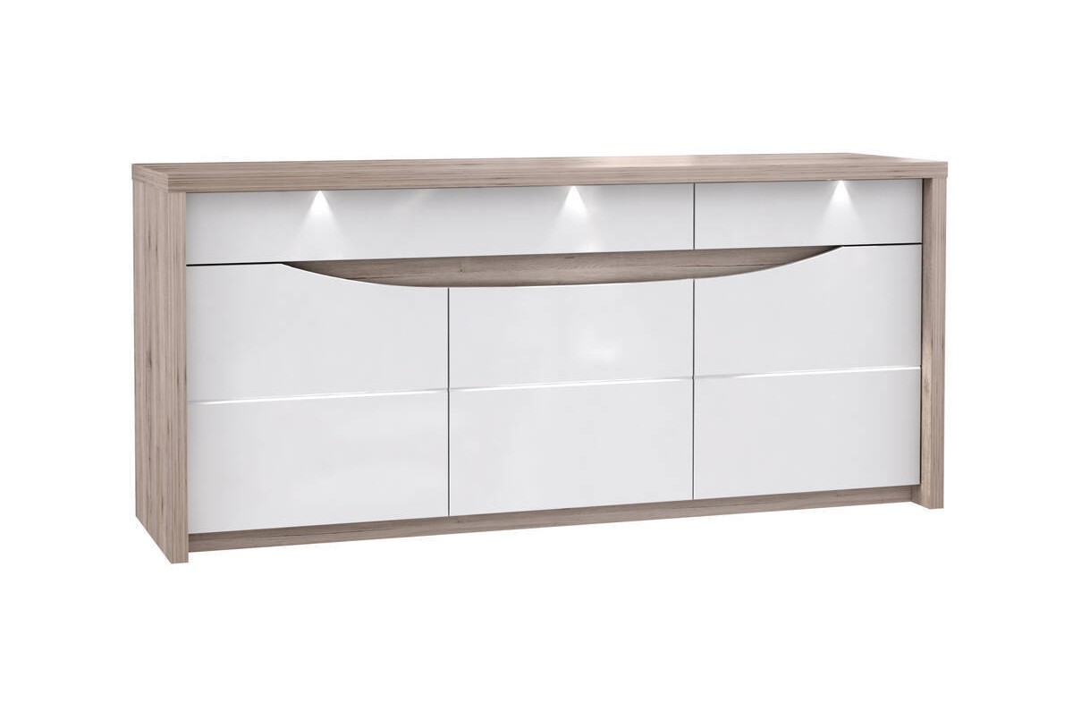 ¡Usa el aparador de 187 con 3 puertas 2 cajones para tu sala de estar o para cualquier estanca del hogar! Gracias a sus acabados en color Roble Arena con los frentes en color Blanco Brillo, será el complemento perfecto para una decoración acogedora añadiendo mucho espacio de almacenamiento. En los 3 cajones, las notas, los archivos y el material de oficina estará siempre a mano, así como en los cubiertos y la mantelería. Tras las puertas, varios compartimientos grandes pueden acomodar platos, textiles para el hogar o sus libros de consulta. El sistema de iluminación integrado hará que brille como el primer día.