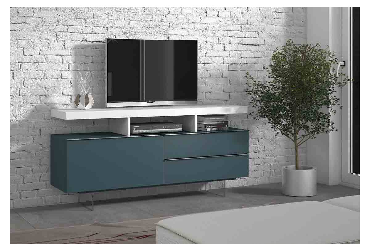 El mueble de tv de 160 cm Adams cambiara el concepto e diseño en su hogar, gracias a sus 160 cm ofrece a nuestro tv un espacio generoso donde poder descansar. Además de espacio para nuestro televisor, también podrá complementar la superficie con algún altavoz pequeño o elemento de decoración. Los 3 compartimentos abiertos debajo son ideales para receptores, reproductores de DVD y videojuegos, tendremos todos los elementos organizados. Tras los dos cajones y la puerta batiente podremos organizar nuestras películas favoritas o la de los pequeños de la casa. Unos de los cajones podremos reservarlo para álbumes de fotos o carpetas con documentación. Llama la atención la base con patas de cristal, podremos tener la parte inferior también recogida y disfrutar de la composición gracias a este moderno complemento.