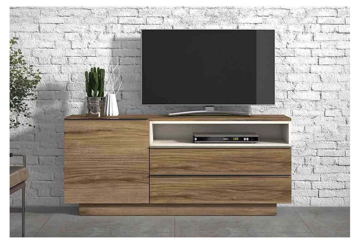 El mueble de tv de 160 cm Eagle combina a la perfección tonos naturales con un estilo moderno característico. La combinación de colores en contraste será perfecta para cualquier decoración. Podrás elegir entre los diferentes colores a disposición. Una amplia superficie será el lugar ideal para nuestro smart tv. Bajo el televisor tras una puerta batiente y dos cajones, podremos tener organizadas nuestras películas favoritas o juegos de mesa para disfrutar en familia. En practico espacio diáfano será el lugar ideal para tener organizados nuestros elementos electrónicos como el reproductor de Blue-ray. Un elegante zócalo será el encargado de alzar toda la composición.