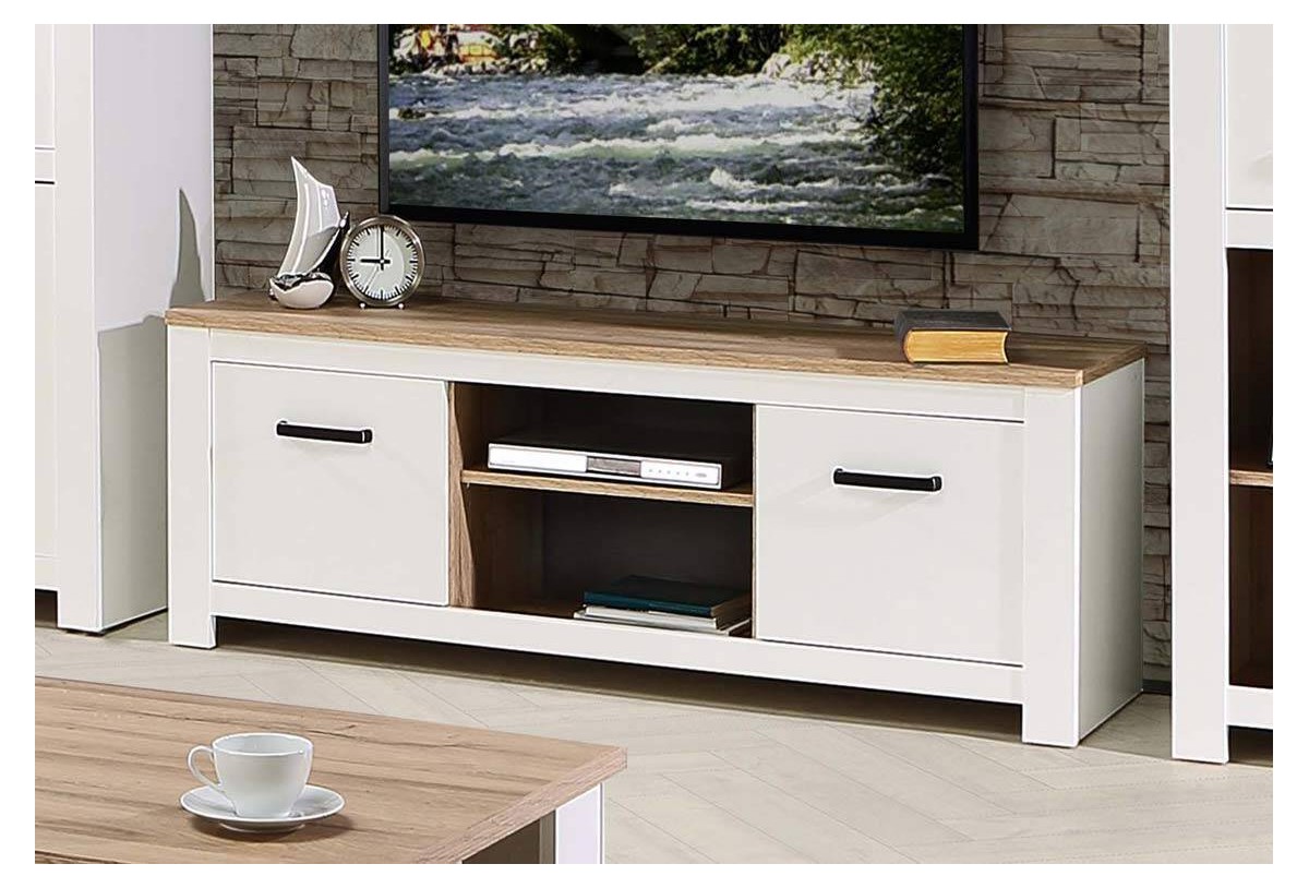 Con el mueble de tv de Frisco, su Smart Tv estará siempre en el centro de atención. La combinación en color blanco mate y color roble, es un acierto seguro que aporta luminosidad y estilo en todos los ambientes. El espacio para almacenamiento se compone por dos puertas y dos prácticos espacios abiertos. Este práctico y moderno mueble de tv, garantizan muchas opciones de almacenamiento para los reproductores de Blue-ray, consolas de juegos, cables o revistas de tv, etc.