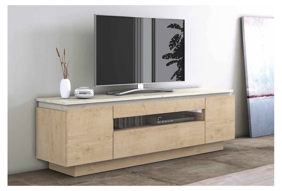 El mueble de tv de 180 cm Scott se convertirá en la pieza central de nuestra decoración en el salón. La robusta y amplia superficie del mueble de tv nos permitirá disfrutar de nuestra smart tv. Dos puertas batientes y un amplio cajón aportaran todo el espacio de almacenamiento. Tras las puertas espacio suficiente para guardar utensilios para nuestro día a día como parte de la vajilla o documentación en pequeños archivadores. En cambio el cajón será perfecto para organizar nuestros elementos electrónicos como reproductores de Blue-ray o videoconsola, su parte diáfana de cristal favorecerá su funcionamiento. La posibilidad de elegir entre diferentes colores hace del mueble de tv Scott una pieza ideal.
