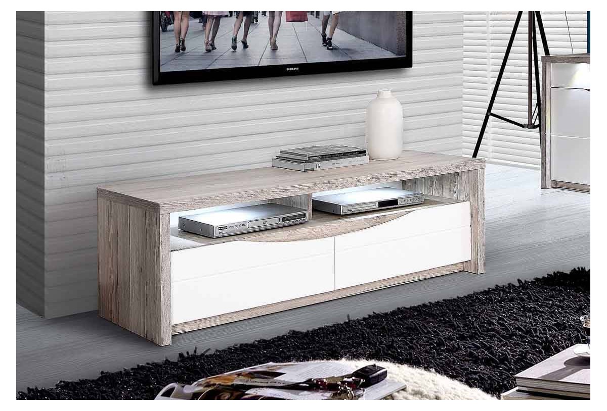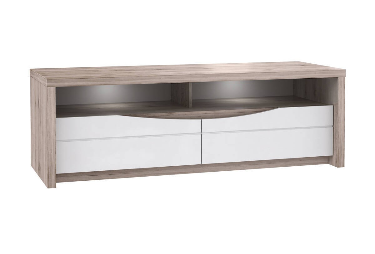 El mueble de tv de 148 cm con 2 cajones es un complemento perfecto para la decoración del hogar. Sus acabados en Roble Arena y Blanco Brillo hacen destacar la pieza. Con 148 cm tendremos espacio suficiente para colocar nuestra Smart Tv y algún elemento decorativo si procede, además 50 cm de alto da la perspectiva adecuada para ver el televisor de manera correcta. Visualmente es una opción acertada, pero además es un mueble practico; cuanta con dos espacios abiertos para los reproductores Blue-Ray o las consolas de los niños. Dos amplios cajones nos permiten tender resguardados del polvo los juegos de mesa y nuestras películas favoritas.