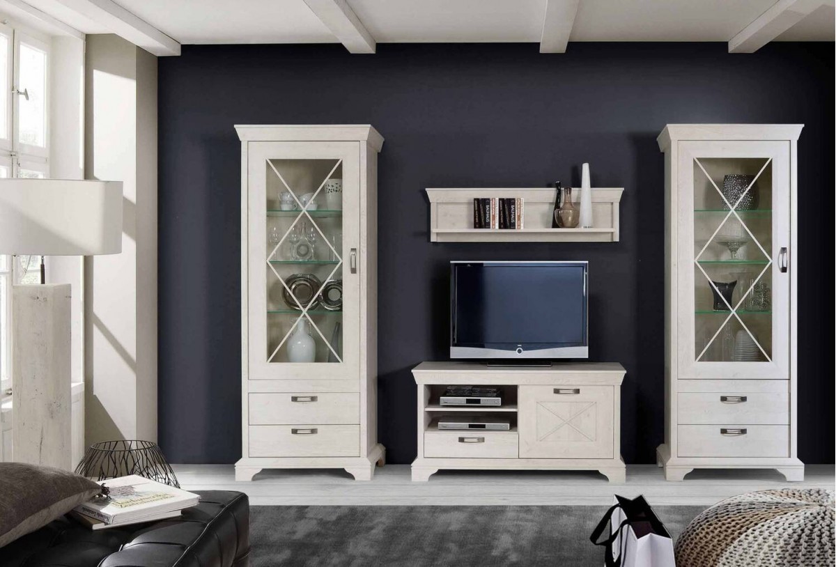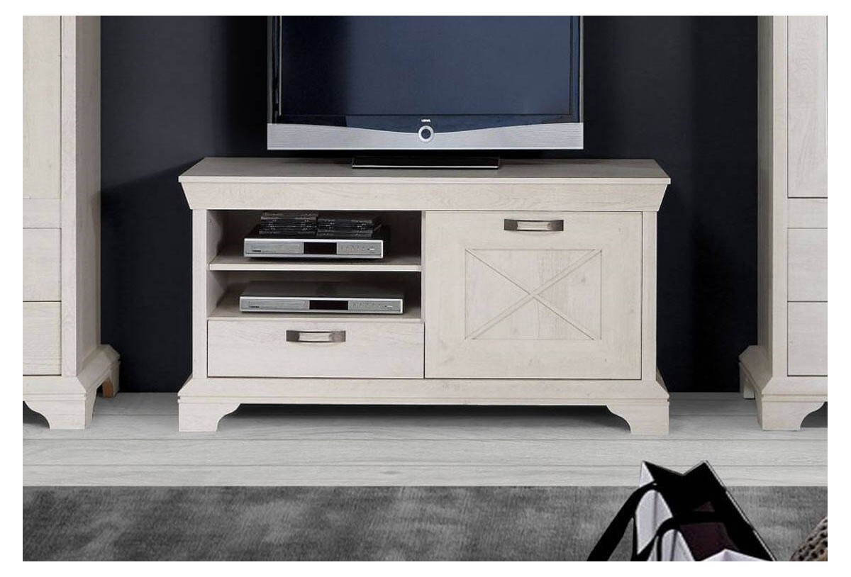 El mueble de Tv de 123 cm representa el confort con un marcado toque rustico. Este mueble de Tv se basa en valores clásicos y siempre está de moda. Los acabados en color Pino Blanco determina el aspecto agradable. Los detalles en aspa de los frentes combinan con los tiradores de bronce. Un detalle elegante gracias a que tanto la parte inferior como superior tienen un acabado más detallado. Además de que su televisor también tiene un montón de espacio para accesorios: en los dos compartimentos abiertos están la consola y el reproductor de DVD. Un cajón y una puerta proporcionan almacenamiento extra donde poder tener nuestras películas favoritas.