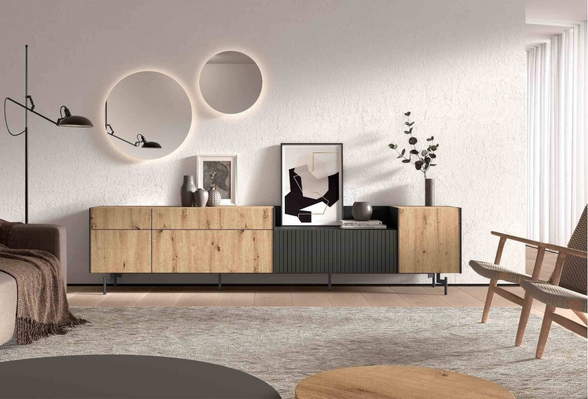 - Bajo izquierdo de 135 x 45,2 x 48 cm con 2 cajones y 2 contenedores