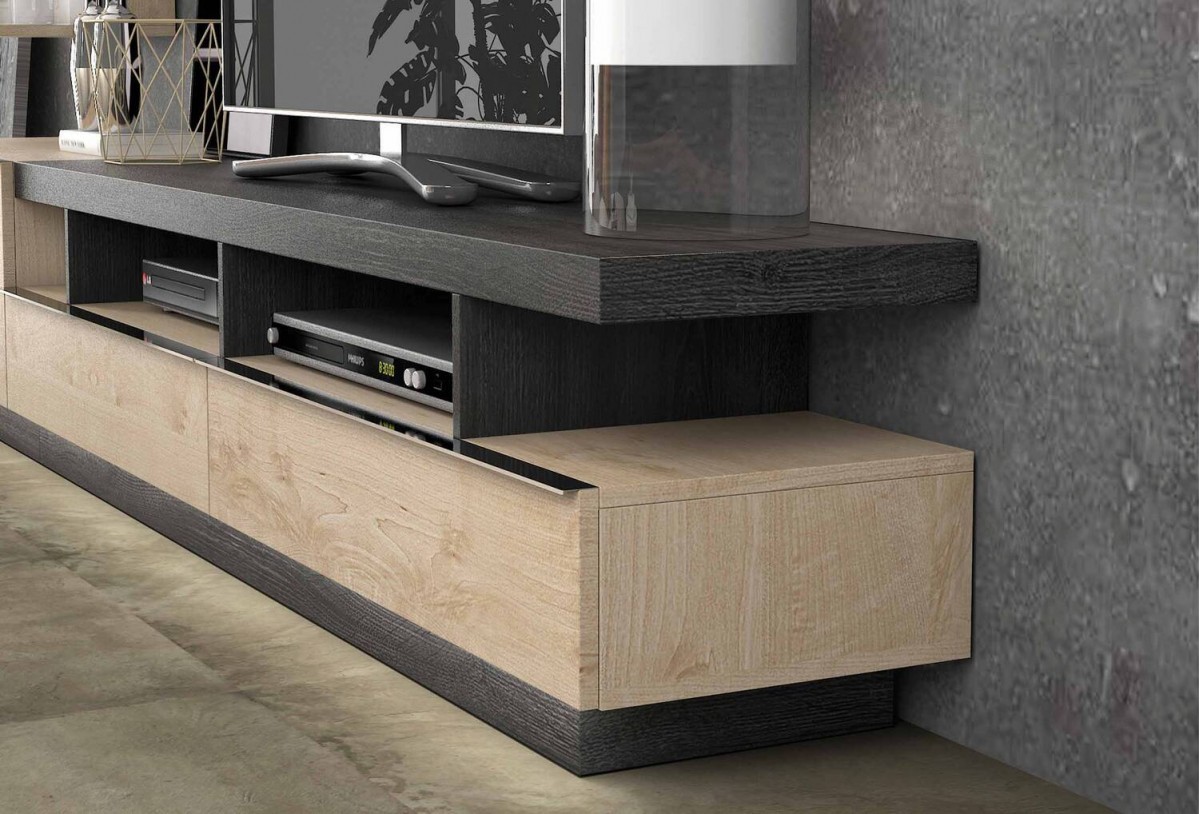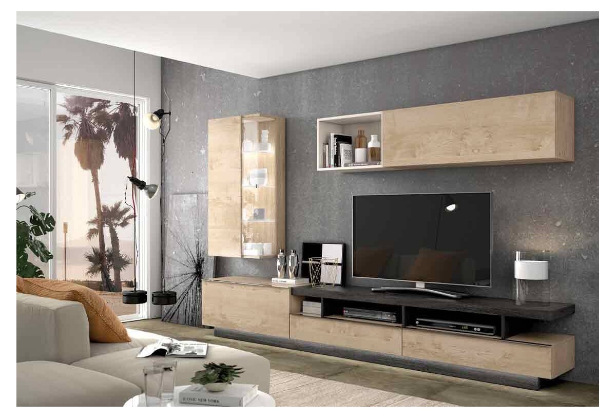 El mueble de salón de 300 cm Madison irradia un ambiente hogareño con un encanto acogedor a la par que moderno. Los frentes lisos destacan junto con la cantidad de espacios diáfanos de los que consta el conjunto. La estética general viene dada por la perfecta combinación de acabados y colores. Dispones de diferentes colores para confeccionar el aspecto del mueble de salón a tu gusto. Nuestra smart tv tendrá un lugar destacado en la decoración del salón. En la zona baja dispondremos de barios módulos que con sus amplias dimensiones tendremos espacio más que suficiente para que nuestro televisor descanse y poder decorar con algún elemento decorativo. El espacio de almacenamiento viene dado por dos amplios cajones y un modulo contiguo con puerta abatible. Tendremos nuestro salón siempre recogido, revistas algún cojín o documentación siempre estará al alcance de la mano. El sobre tv aporta varios huecos diáfanos, perfectos para nuestro reproductor Blue-ray u otros elementos electrónicos. Nuestros objetos favoritos siempre necesitan un lugar especial. Un amplio modulo alto cumple su función a la perfección con su cristal y puerta batiente. Los estantes enfatizan la elegancia de la vitrina. Sobre el televisor un modulo alto, tras su puerta elevable copas, cubertería o nuestra colección de películas favoritas tendrán un lugar garantizado. Un espacio diáfano en la zona alta permite dar importancia a algunos libros o jarrón de valor.