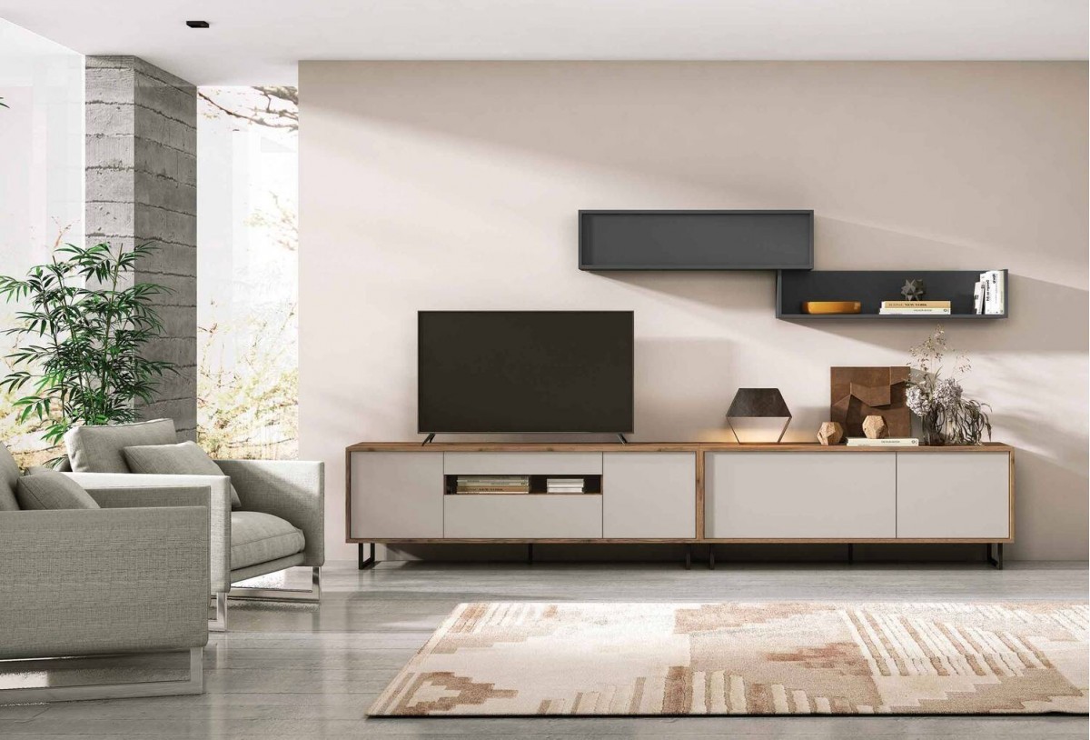 - Bajo de 158 x 42 x 48 cm con 1 cajón cristal y 2 puertas, con pata metal 14 cm de alto