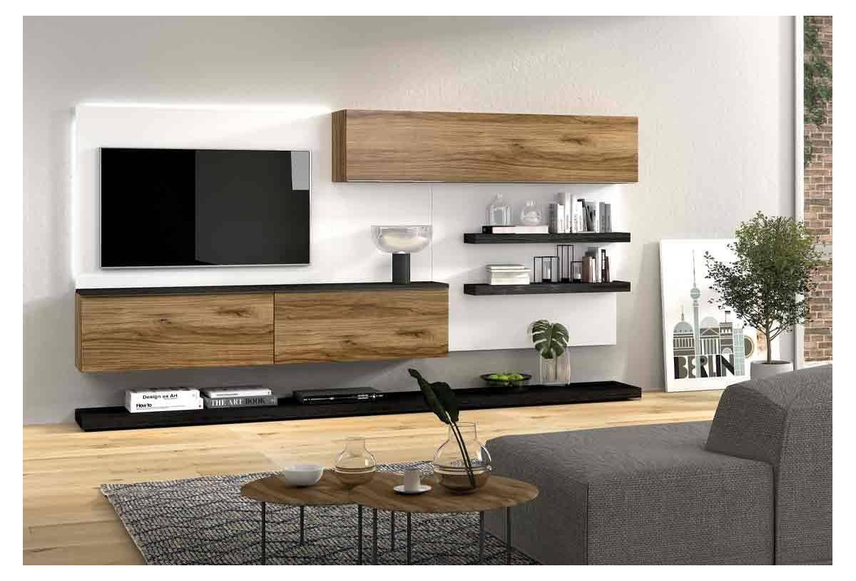 El mueble de salón de 320 cm Blount destaca por sí solo, su diseño moderno y atrevido será un complemento ideal para complementar tu amplio salón. La combinación de colore a disposición harán que combine a la perfección con cualquier ambiente. Destaca los paneles de la pared, una amplia zona que servirá como lienzo para plasmar todo el mueble de salón; ya que este se sustenta en el aire. Un toque elegante y moderno que no dejara indiferente a nadie. Dos módulos altos con puerta abatible serán los encargados de dar espacio para nuestro televisor, tras sus puertas un amplio espacio con el cual contaremos para organizar nuestros elementos electrónicos como consolas o reproductores de video. En la parte alta un modulo con puerta elevable, será una zona ideal para organizar menaje extra como platos o copas. Bajo el dos estantes nos permitirán tener a mano libros de consulta o decorar el salón con algún objeto decorativo. En la zona baja la podremos decorar a nuestro gusto, con algún jarrón pequeño o planta ornamental, además de poder usarla como estante para libros.