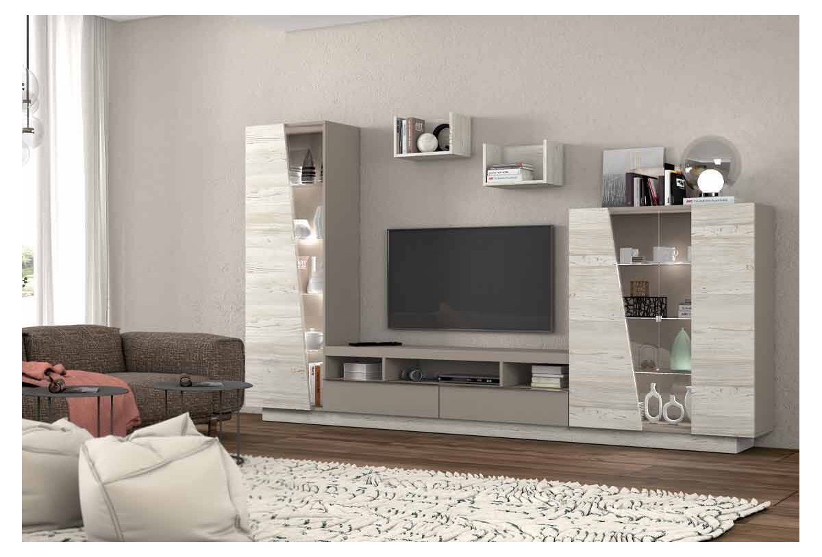 El mueble de salón de 320 cm Riverside es la opción acertada en cuanto decoración se refiere, sus ampliadas dimensiones lo hacen perfecto para grandes salones. Su diseño desigual característico es un punto que gustara tanto a grandes como pequeños. El televisor es el centro de atención en cualquier salón, en el mueble de salón Riverside descansa sobre dos módulos centrales y unos espacios diáfanos. Los cajones son perfectos para guardar documentación o toda nuestra colección de Blue-rays. En la parte lateral un modulo con dos puertas batientes, podremos tener siempre recogido nuestro salón, el espacio se divide en diferentes donde colocar juegos de té, recuerdos de vacaciones o algún jarrón valioso. La puertas con cristal añadido harán que el interior participe también en la decoración; podrás lucir tus tesoros mas precisados resguardados del polvo. En la parte opuesta un modulo bajo, tras su puerta batiente encontraremos varios estantes donde organizar, platos, copas incluso una modesta colección de libros. Además esta cuenta con una zona diáfana, su cristal nos permitirá mostrar el interior. Podremos dar un poco mas creatividad a la composición con los estantes sobre la televisión, podrás lucir tus objetos en dos alturas diferentes.